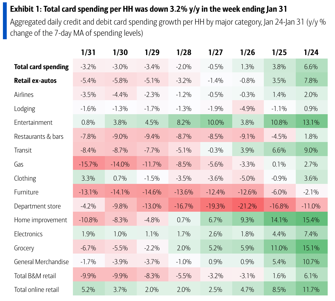 From BofA: “Total card spending per HH was down 3.2% y/y in the week ending Jan 31, according to BAC aggregated credit & debit card data. The slowdown was most likely due to Winter Storm Fern. HI, groceries, gas, transit & general merch decelerated significantly. Moreover, there was little change in total card spending growth in CA and FL, which were unaffected by the storm.”