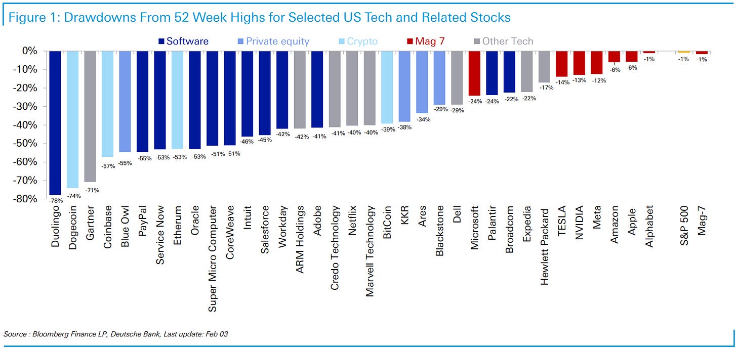 On Wednesday, Deutsche Bank’s Jim Reid circulated this chart of how far down many of these stocks are from their 52-week highs.