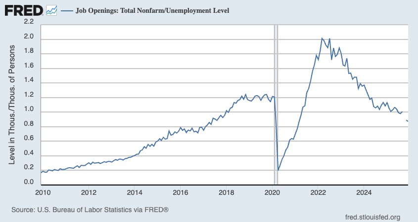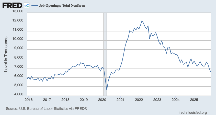 💼 Job openings fall. According to the BLS’s Job Openings and Labor Turnover Survey, employers had 6.54 million job openings in December, down from 6.93 million in November. This metric is at its lowest point since September 2020.