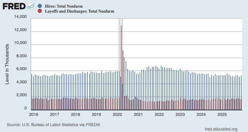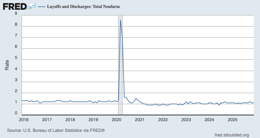👍 Layoffs remain depressed, hiring remains firm. Employers laid off 1.76 million people in December. While challenging for the people affected, this figure represents just 1.1% of total employment. This metric remains slightly below prepandemic levels.