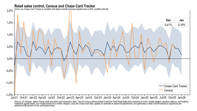 💳 Card spending data is holding up. From JPMorgan: “As of 30 Jan 2026, our Chase Consumer Card spending data (unadjusted) was 4.8% below the same day last year. Based on the Chase Consumer Card data through 30 Jan 2026, our estimate of the US Census December control measure of retail sales m/m is 0.41%.”