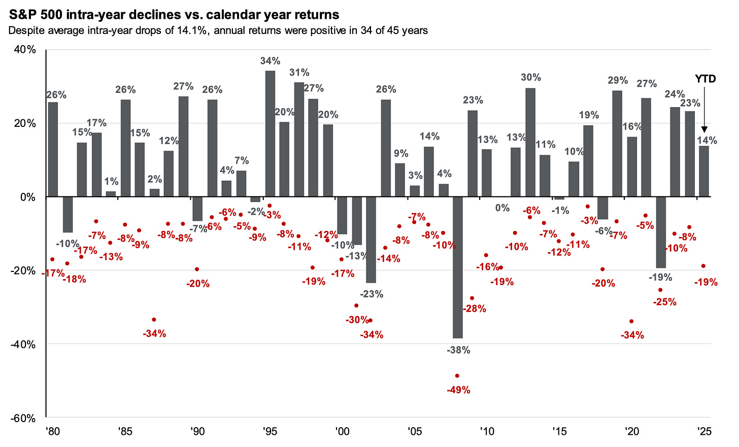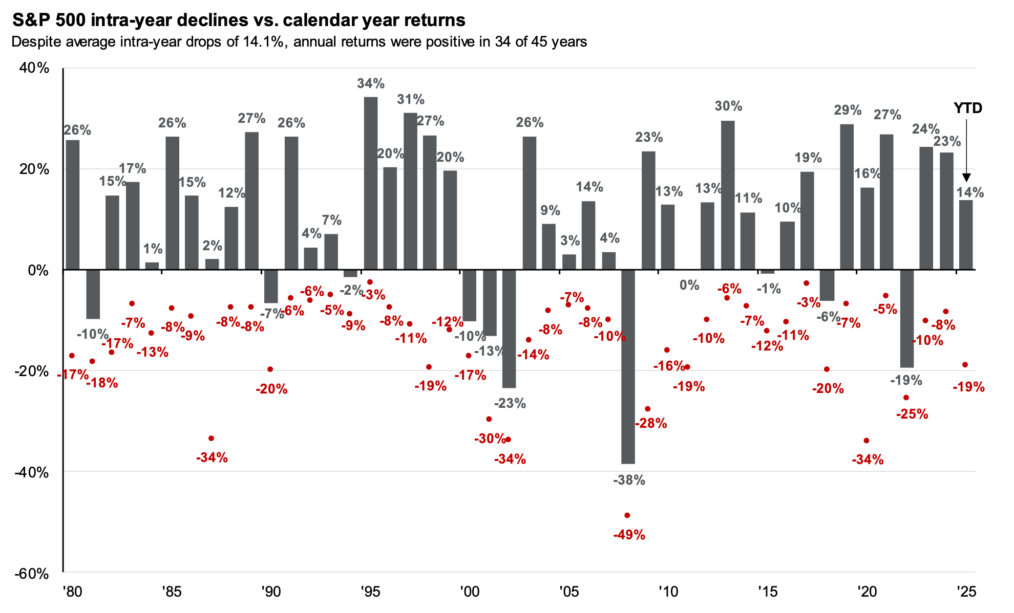Investors should always be mentally prepared for some big sell-offs in the stock market. It’s part of the deal when you invest in an asset class that is sensitive to the constant flow of good and bad news. Since 1950, the S&P 500 has seen an average annual max drawdown (i.e., the biggest intra-year sell-off) of 14%.