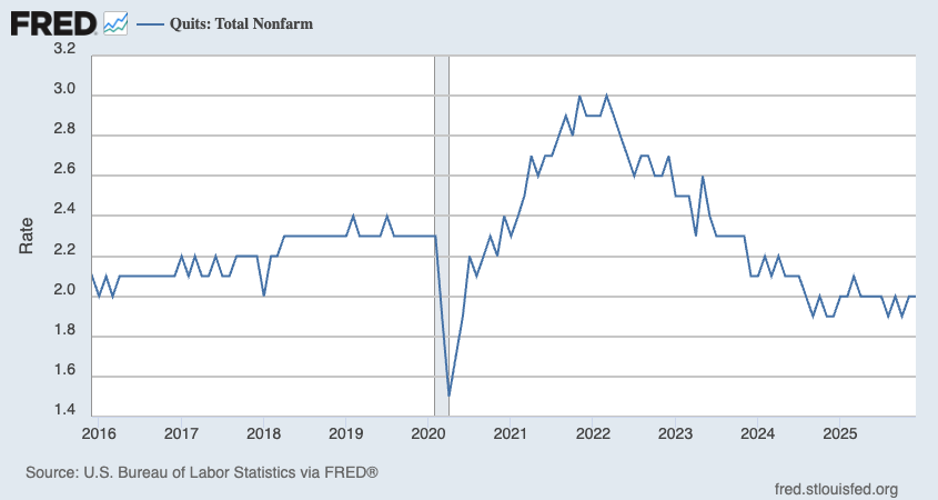 🤔 People are quitting less. In December, 3.20 million workers quit their jobs. This represents 2.0% of the workforce. The rate continues to trend below prepandemic levels.