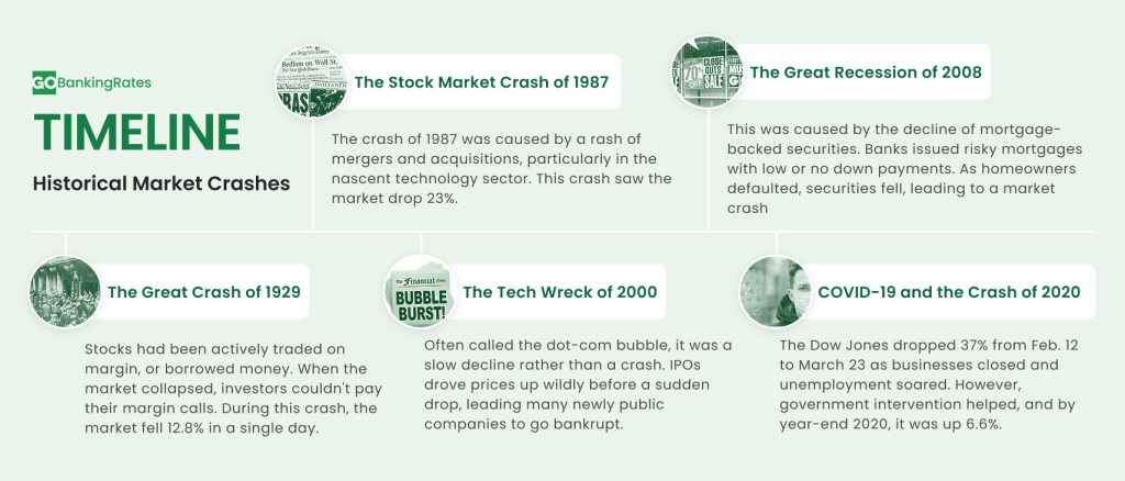 A market crash can be caused by a number of factors. Past experiences include 1929 when the market collapsed and investors couldn’t meet margin calls. Another example was the tech crash in 2000 when the price of tech companies rose very quickly, then subsequently plummeted.