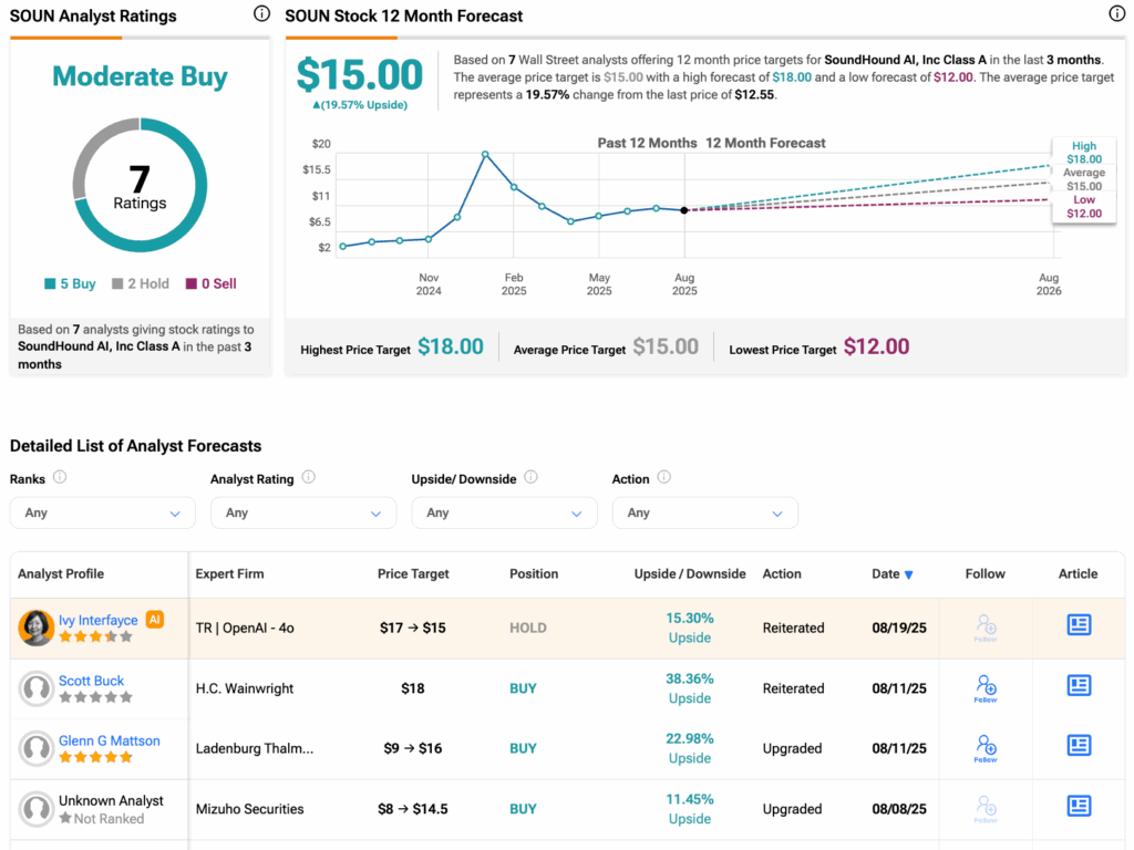 According to TipRanks, SOUN stock has received a Moderate Buy consensus rating, with five Buys and two Holds assigned in the last three months. The average SoundHound stock price target is $15, suggesting a potential upside of 19.57% from the current level.