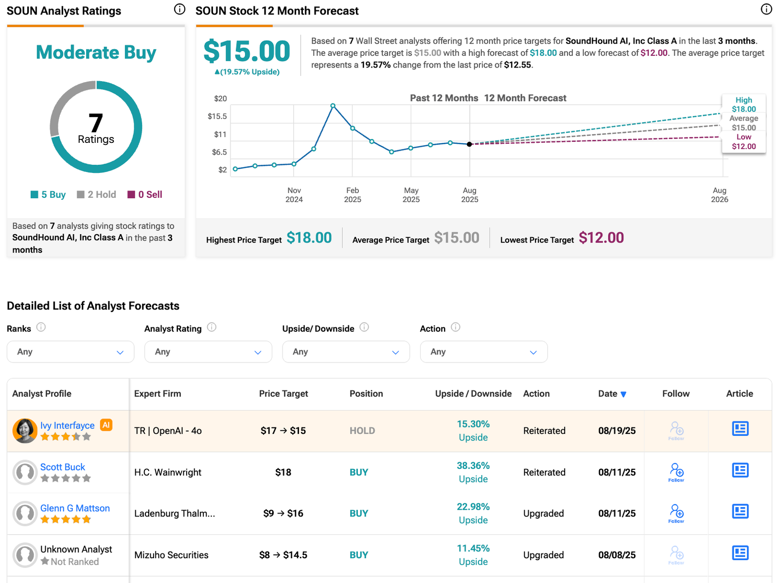 According to TipRanks, SOUN stock has received a Moderate Buy consensus rating, with five Buys and two Holds assigned in the last three months. The average SoundHound stock price target is $15, suggesting a potential upside of 19.57% from the current level.