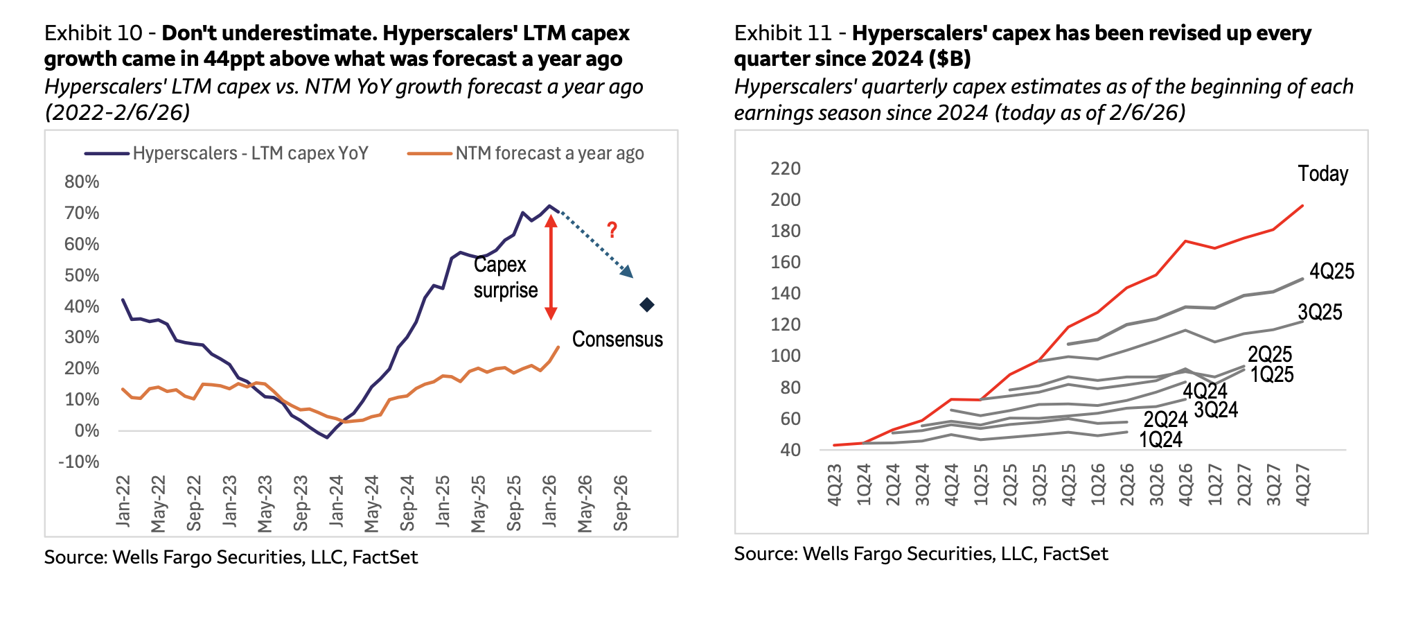 “Hyperscalers have consistently invested more than what consensus had expected – over the [last 12 months], they grew capex 50 percentage points above what consensus had penciled in a year before,” Kwon and his team said. Here’s what those underestimations look like in charts: