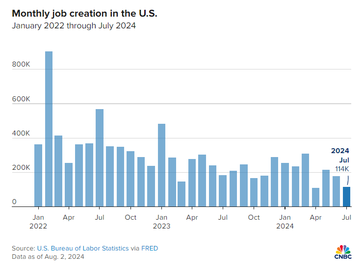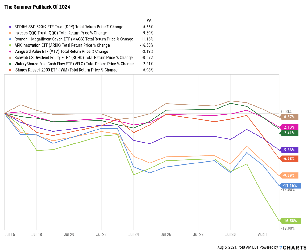 That’s created massive margin calls for hedge funds that were massively short the Yen. Like how managed futures were shorting bonds for two years, hedge funds shorted the hell out of the Yen when it hit 36-year lows. And now, suddenly, a recession scare in the US, US rates crash, and the dollar vs the Yen implodes. Catching huge Wall Street money is completely off-side. Thus, everything has massive sell-offs, from growth to value to Mag 7.
