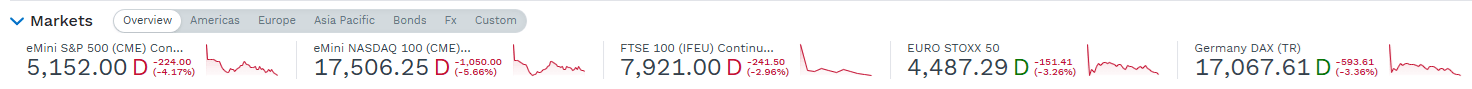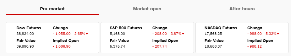 Pre-market S&P futures are down almost 4%, and the Nasdaq is down over 5%, wiping out $1.4 trillion in market cap in one day, and that’s just for the Nasdaq.