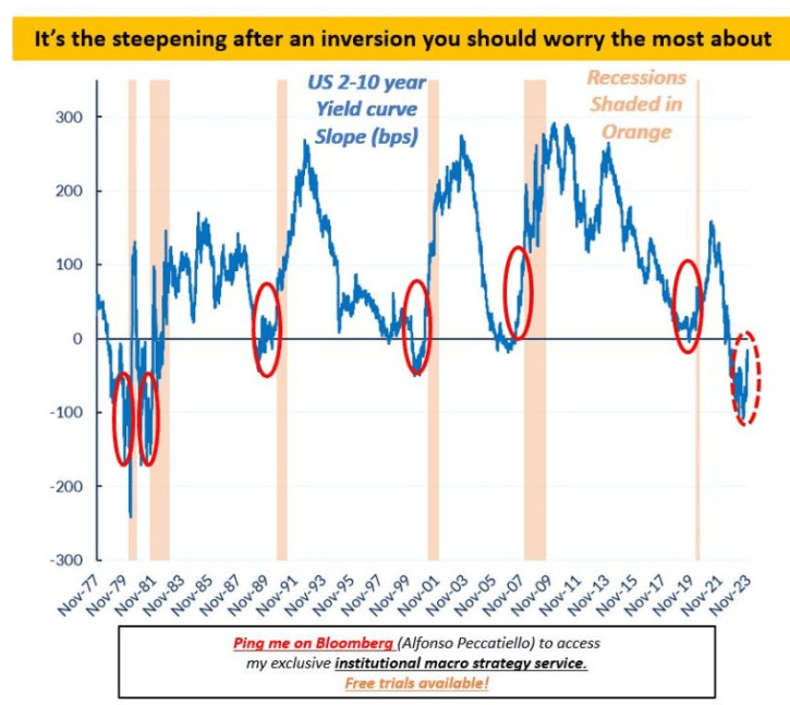 However, that’s because a positive sloping yield curve is normal long-term. The curve can’t be inverted forever, and so either the economy goes into recession, and the Fed cuts short-term rates so they fall below long-term rates, or long-term rates can rise (due to lack of recession) in a bear steepening.