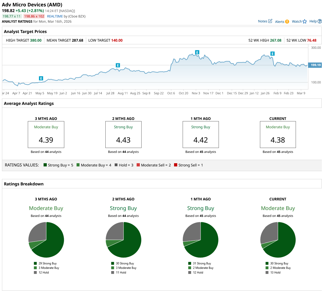Out of the 45 analysts covering AMD stock, 30 recommend “Strong Buy,” two recommend “Moderate Buy,” and 13 recommend “Hold.” The average AMD stock price target is $287.68, above the current price of about $199.