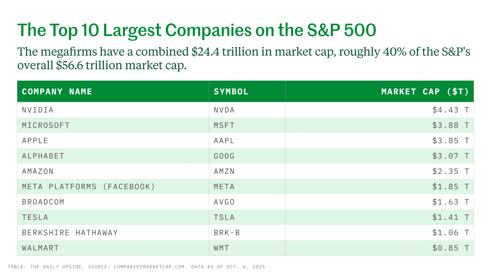 That’s according to Bryan Taylor, the chief economist at the financial data firm Finaeon, who has over 200 years of financial data upon which to base this statement. The stock market has simply never been this concentrated. In fact, the 10 most valuable US companies had a market capitalization of nearly $24.4 trillion as of October 23, according to CompaniesMarketCap.com. The heavy concentration is in large-cap growth tech stocks.